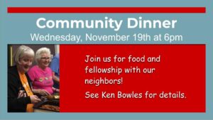 We have several members of our church family who could use some meals. Can you help? Cooking, providing take-out, and supplying gift cards can help support the efforts of our meal train. Contact Barbara Stutzman or the office for more information on what is needed.